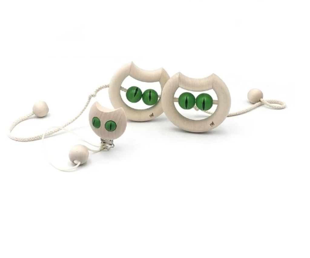 名稱「Miau」指的正是貓咪「喵喵喵」的叫聲,小貓那充滿吸引力、骨碌碌轉的祖母綠雙眼讓寶寶難以抗拒,木球撞擊發出喀噠喀噠的聲響更激起寶寶的好奇心。